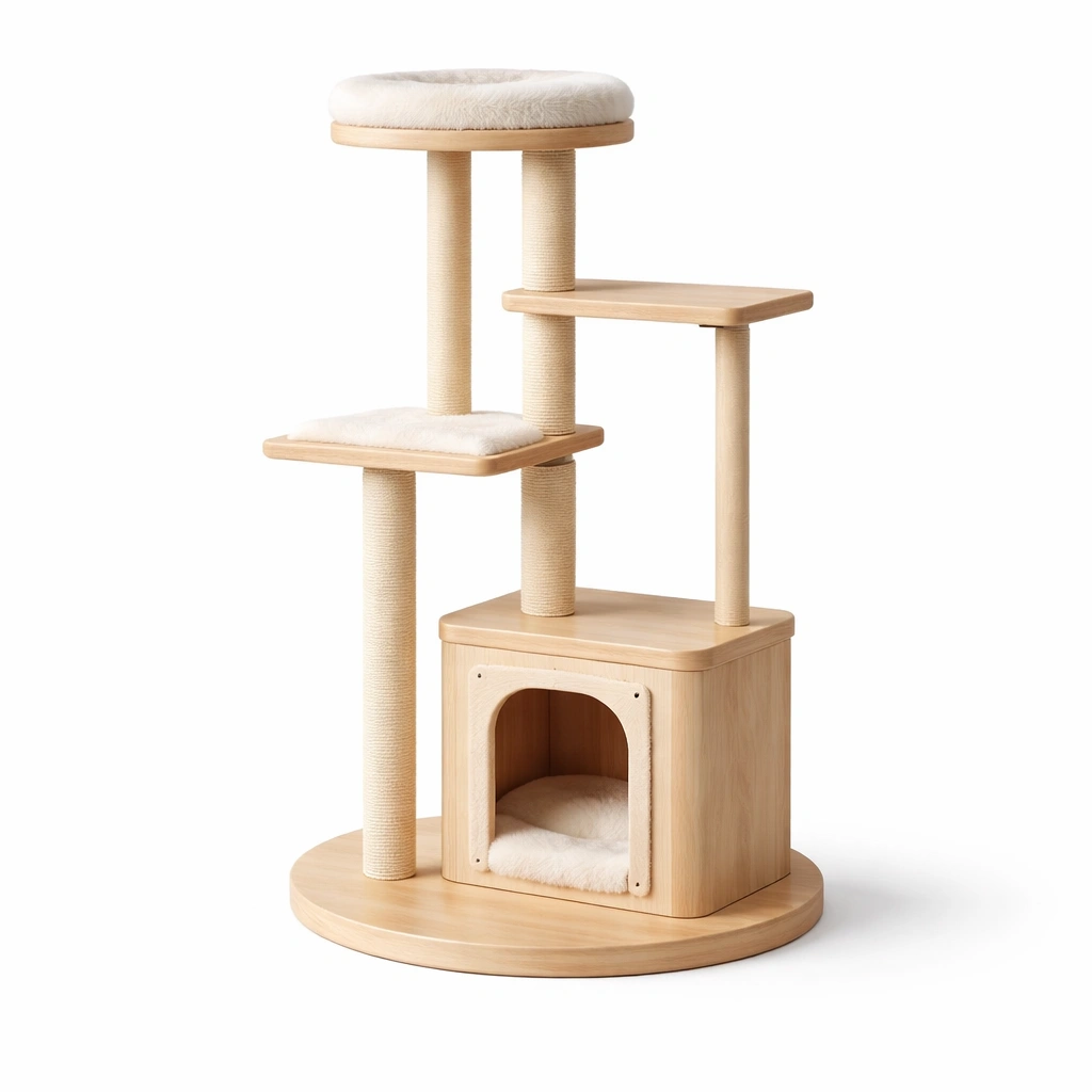 Der Katzenbaum besteht aus robustem Sperrholz und ist mit weichem, beigefarbenem Plüsch überzogen. Die Gesamthöhe beträgt 120 cm, der Durchmesser der Basis ist 50 cm. Die drei Plattformen haben eine Größe von jeweils 40 cm x 30 cm. Enthalten sind eine Ruhehöhle mit weicher Polsterung und drei mit Sisalseil umwickelte Kratzsäulen.