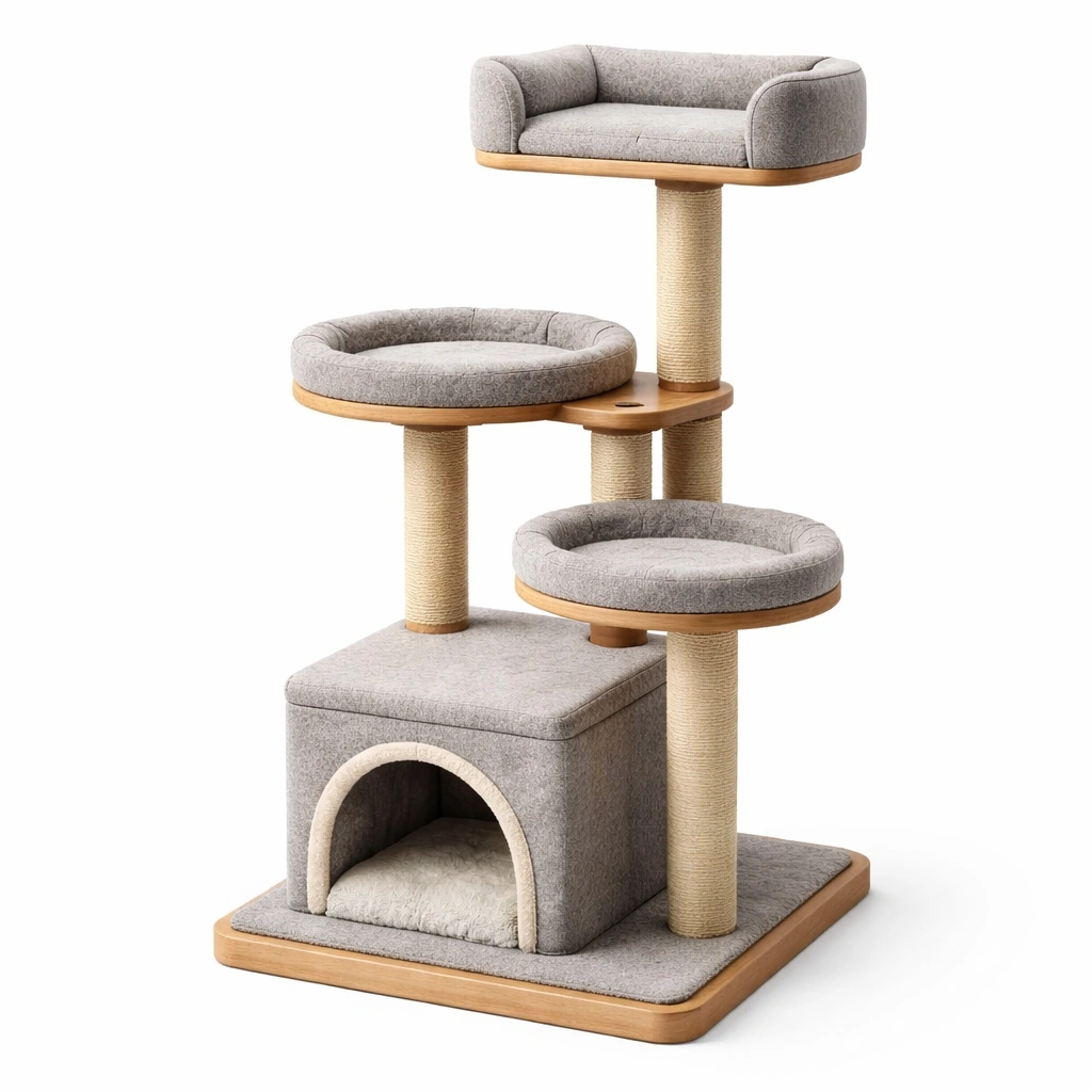 Der Katzenbaum besteht aus einem Holzrahmen und mit Sisal umwickelten Pfosten. Die Liegeflächen und die Höhle sind mit Polyester gepolstert.